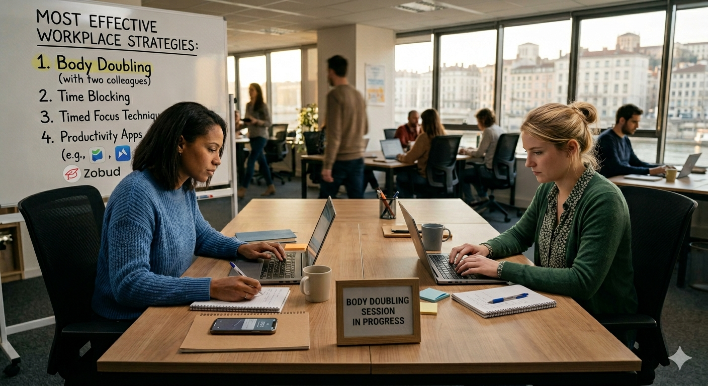 According to a large 2025 international reader survey by ADDitude Magazine, adults with ADHD ranked body doubling as the most effective workplace productivity strategy — outperforming popular tools like productivity apps, time blocking, and timed focus techniques (such as Pomodoro)